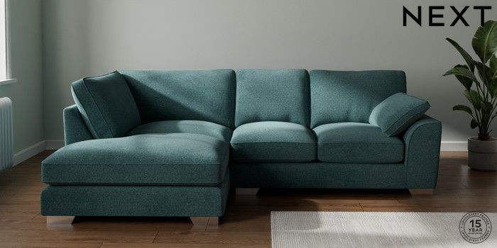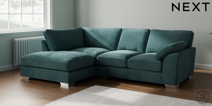 7.3.1 Buy Stamford Grand Relaxed Sit Medium Corner Chaise - Left Hand Chunky Chenille Mid Teal Green Large Square Angle - Chrome Metal from the Next UK online shop Click here to use our accessible website