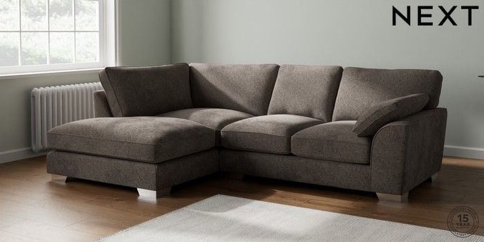 7.3.1 Buy Stamford Grand Relaxed Sit Medium Corner Chaise - Left Hand Chunky Chenille Mink Brown Large Square Angle - Chrome Metal from the Next UK online shop Click here to use our accessible website