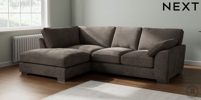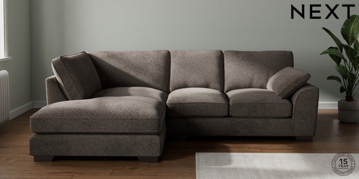 7.3.1 Buy Stamford Grand Relaxed Sit Medium Corner Chaise - Left Hand Chunky Chenille Mink Brown Large Square Angle - Gunmetal from the Next UK online shop Click here to use our accessible website