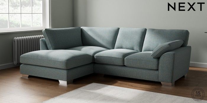 7.3.1 Buy Stamford Grand Relaxed Sit Medium Corner Chaise - Left Hand Chunky Marl Mid Blue Large Square Angle - Chrome Metal from the Next UK online shop Click here to use our accessible website