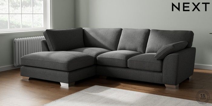 7.2.10 Buy Stamford Grand Relaxed Sit Medium Corner Chaise - Left Hand Chunky Texture Dark Grey Large Square Angle - Chrome Metal from the Next UK online shop Click here to use our accessible website