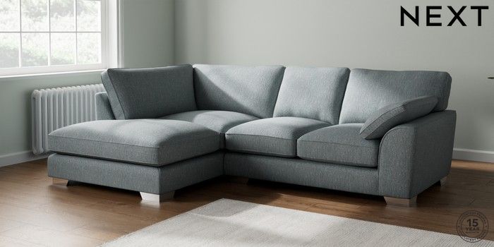 7.3.1 Buy Stamford Grand Relaxed Sit Medium Corner Chaise - Left Hand Chunky Weave Mid Blue Large Square Angle - Chrome Metal from the Next UK online shop Click here to use our accessible website