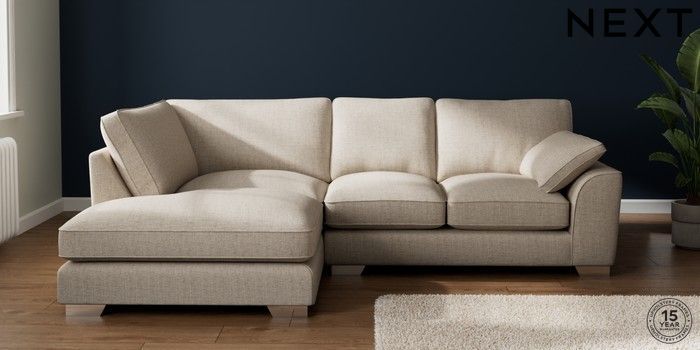 7.3.1 Buy Stamford Grand Relaxed Sit Medium Corner Chaise - Left Hand Chunky Weave Mid Natural Large Square Angle - Chrome Metal from the Next UK online shop Click here to use our accessible website