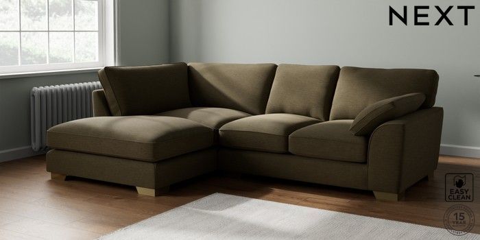 7.3.1 Buy Stamford Grand Relaxed Sit Medium Corner Chaise - Left Hand Fine Chenille Easy Clean Dark Moss Green Large Square Angle - Brushed Brass from the Next UK online shop Click here to use our accessible website