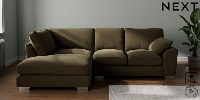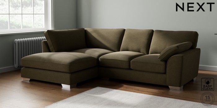 7.3.1 Buy Stamford Grand Relaxed Sit Medium Corner Chaise - Left Hand Fine Chenille Easy Clean Dark Moss Green Large Square Angle - Chrome Metal from the Next UK online shop Click here to use our accessible website