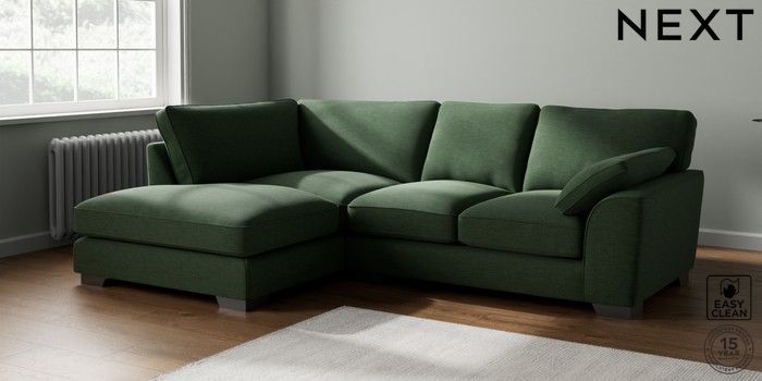 7.3.1 Buy Stamford Grand Relaxed Sit Medium Corner Chaise - Left Hand Fine Chenille Easy Clean Mid Khaki Green Large Square Angle - Gunmetal from the Next UK online shop Click here to use our accessible website