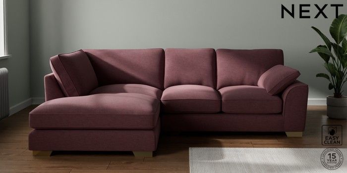 7.3.1 Buy Stamford Grand Relaxed Sit Medium Corner Chaise - Left Hand Fine Chenille Easy Clean Mid Mulberry Purple Large Square Angle - Brushed Brass from the Next UK online shop Click here to use our accessible website