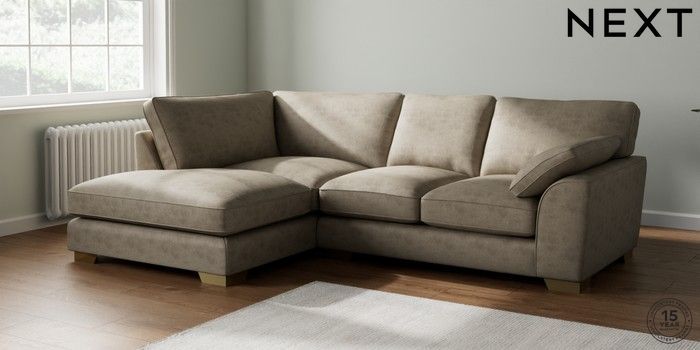 7.3.1 Buy Stamford Grand Relaxed Sit Medium Corner Chaise - Left Hand Monza Faux Leather Easy Clean Mink Brown Large Square Angle - Brushed Brass from the Next UK online shop Click here to use our accessible website