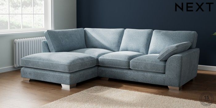 7.2.6 Buy Stamford Grand Relaxed Sit Medium Corner Chaise - Left Hand Plush Chenille Light Blue Large Square Angle - Chrome Metal from the Next UK online shop Click here to use our accessible website