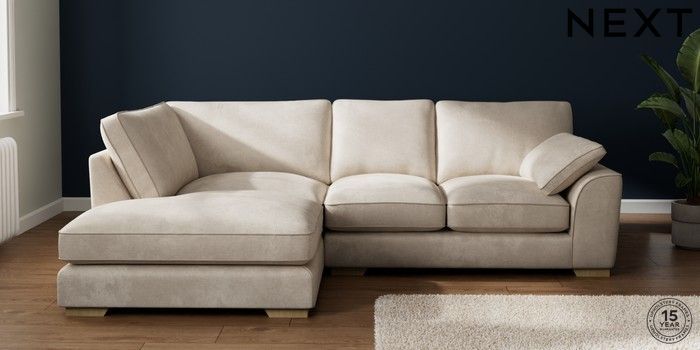 7.3.1 Buy Stamford Grand Relaxed Sit Medium Corner Chaise - Left Hand Plush Chenille Oyster Large Square Angle - Light from the Next UK online shop