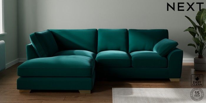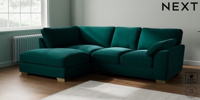 7.3.1 Buy Stamford Grand Relaxed Sit Medium Corner Chaise - Left Hand Plush Velvet Easy Clean Juniper Green Large Square Angle - Brushed Brass from the Next UK online shop Click here to use our accessible website