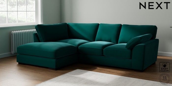 7.3.1 Buy Stamford Grand Relaxed Sit Medium Corner Chaise - Left Hand Plush Velvet Easy Clean Juniper Green Large Square Angle - Dark from the Next UK online shop Click here to use our accessible website
