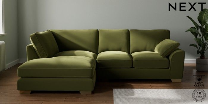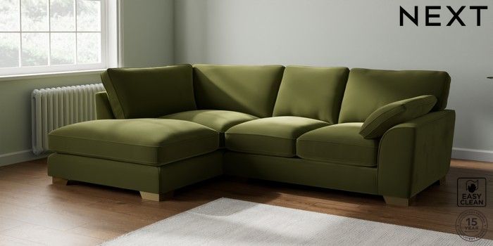 7.3.1 Buy Stamford Grand Relaxed Sit Medium Corner Chaise - Left Hand Plush Velvet Easy Clean Mid Olive Green Large Square Angle - Brushed Brass from the Next UK online shop Click here to use our accessible website