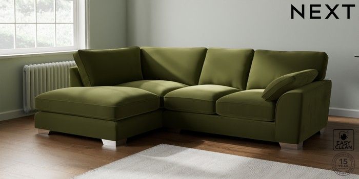 7.3.1 Buy Stamford Grand Relaxed Sit Medium Corner Chaise - Left Hand Plush Velvet Easy Clean Mid Olive Green Large Square Angle - Chrome Metal from the Next UK online shop Click here to use our accessible website