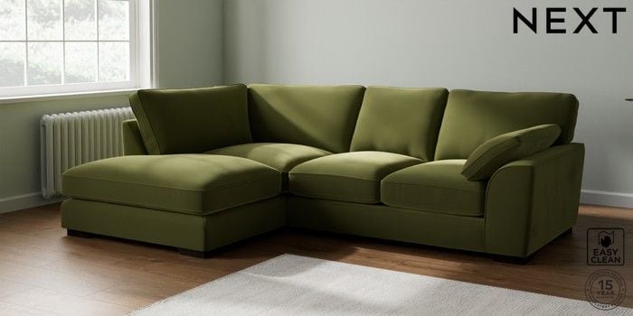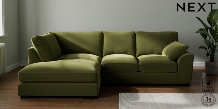 7.3.1 Buy Stamford Grand Relaxed Sit Medium Corner Chaise - Left Hand Plush Velvet Easy Clean Mid Olive Green Large Square Angle - Dark from the Next UK online shop Click here to use our accessible website