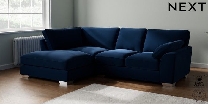 7.3.1 Buy Stamford Grand Relaxed Sit Medium Corner Chaise - Left Hand Plush Velvet Easy Clean Navy Blue Large Square Angle - Chrome Metal from the Next UK online shop Click here to use our accessible website