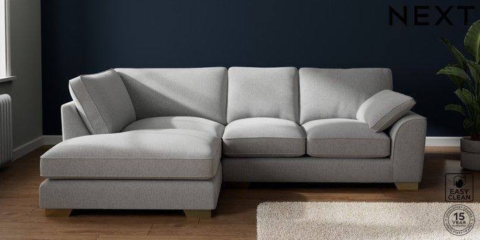 7.3.1 Buy Stamford Grand Relaxed Sit Medium Corner Chaise - Left Hand Tweedy Blend Easy Clean Light Silver Grey Large Square Angle - Brushed Brass from the Next UK online shop Click here to use our accessible website