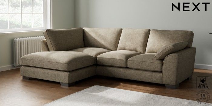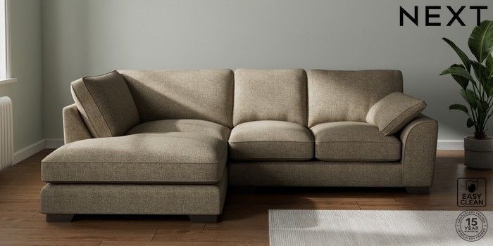 7.3.1 Buy Stamford Grand Relaxed Sit Medium Corner Chaise - Left Hand Woven Chenille Easy Clean Mid Natural Large Square Angle - Gunmetal from the Next UK online shop Click here to use our accessible website