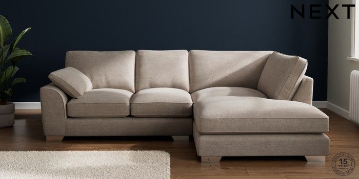 7.3.1 Buy Stamford Grand Relaxed Sit Medium Corner Chaise - Right Hand Boucle Chenille Light Natural Large Square Angle - Chrome Metal from the Next UK online shop Click here to use our accessible website