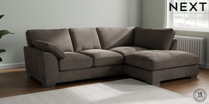 7.3.1 Buy Stamford Grand Relaxed Sit Medium Corner Chaise - Right Hand Chunky Chenille Mink Brown Large Square Angle - Gunmetal from the Next UK online shop Click here to use our accessible website