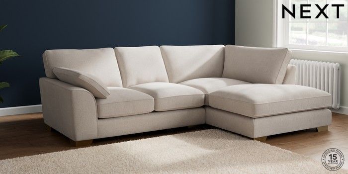7.3.1 Buy Stamford Grand Relaxed Sit Medium Corner Chaise - Right Hand Chunky Chenille Oyster Large Square Angle - Brushed Brass from the Next UK online shop Click here to use our accessible website