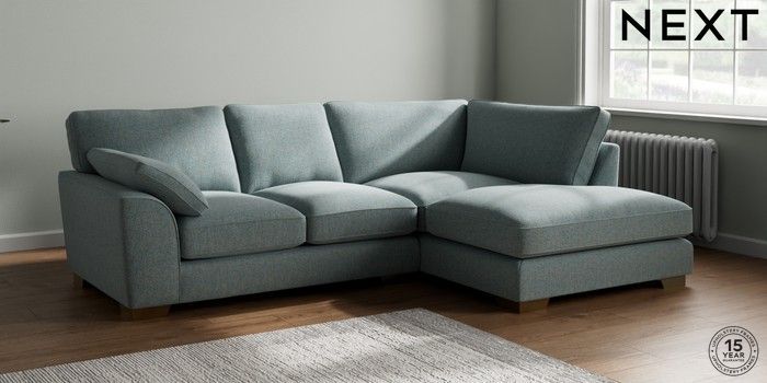 7.2.10 Buy Stamford Grand Relaxed Sit Medium Corner Chaise - Right Hand Chunky Marl Mid Blue Large Square Angle - Brushed Brass from the Next UK online shop Click here to use our accessible website