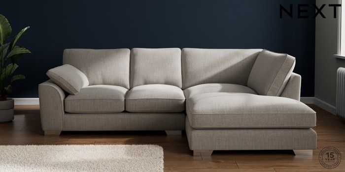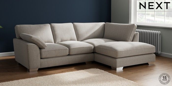 7.3.1 Buy Stamford Grand Relaxed Sit Medium Corner Chaise - Right Hand Chunky Weave Dove Grey Large Square Angle - Chrome Metal from the Next UK online shop Click here to use our accessible website