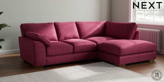 7.2.10 Buy Stamford Grand Relaxed Sit Medium Corner Chaise - Right Hand Cotswold Chenille Dark Raspberry Pink Large Square Angle - Brushed Brass from the Next UK online shop Click here to use our accessible website