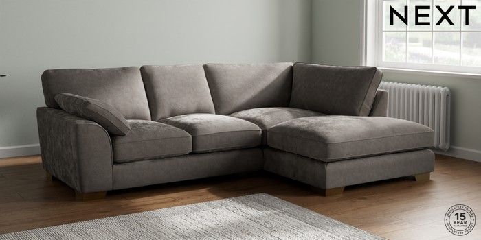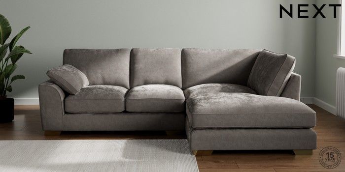 7.3.1 Buy Stamford Grand Relaxed Sit Medium Corner Chaise - Right Hand Distressed Velour French Grey Large Square Angle - Brushed Brass from the Next UK online shop Click here to use our accessible website