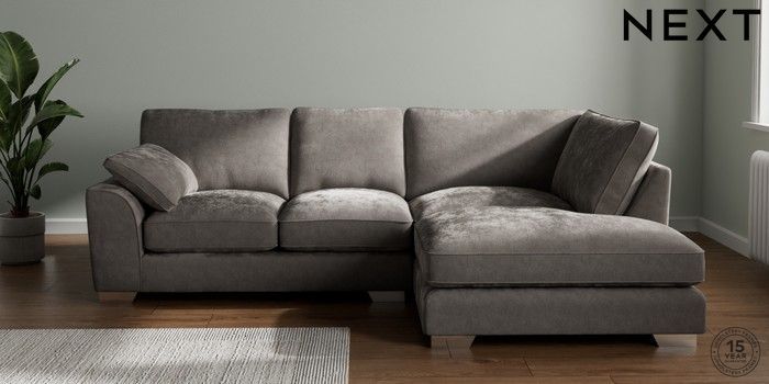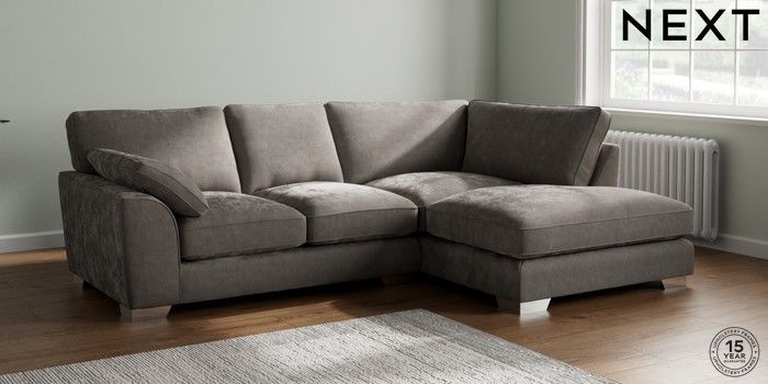 7.3.1 Buy Stamford Grand Relaxed Sit Medium Corner Chaise - Right Hand Distressed Velour French Grey Large Square Angle - Chrome Metal from the Next UK online shop Click here to use our accessible website