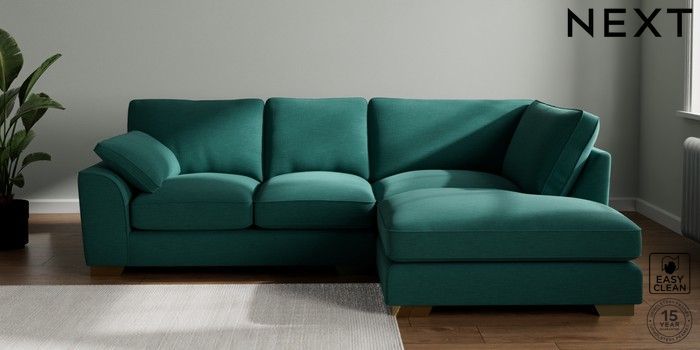 7.3.1 Buy Stamford Grand Relaxed Sit Medium Corner Chaise - Right Hand Fine Chenille Easy Clean Dark Juniper Green Large Square Angle - Brushed Brass from the Next UK online shop Click here to use our accessible website