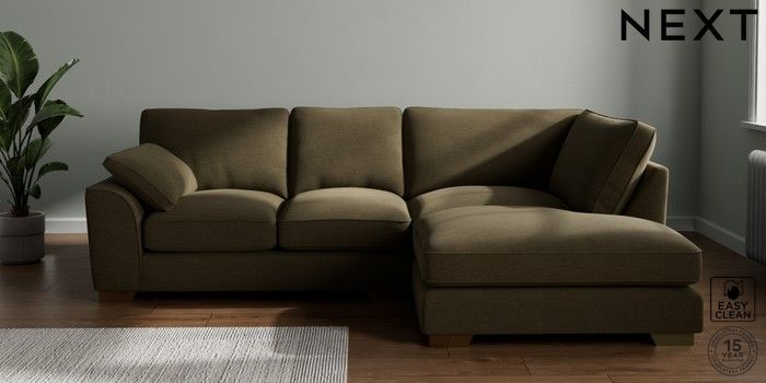 7.3.1 Buy Stamford Grand Relaxed Sit Medium Corner Chaise - Right Hand Fine Chenille Easy Clean Dark Moss Green Large Square Angle - Brushed Brass from the Next UK online shop Click here to use our accessible website