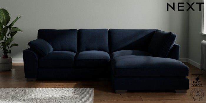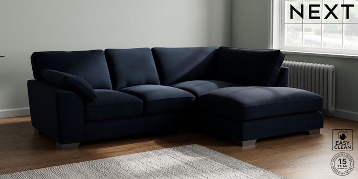 7.3.1 Buy Stamford Grand Relaxed Sit Medium Corner Chaise - Right Hand Fine Chenille Easy Clean Dark Navy Blue Large Square Angle - Gunmetal from the Next UK online shop Click here to use our accessible website