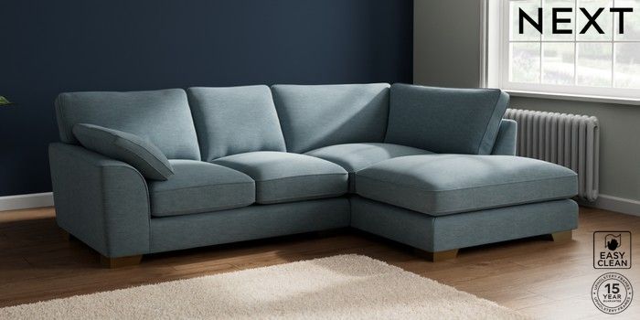 7.3.1 Buy Stamford Grand Relaxed Sit Medium Corner Chaise - Right Hand Fine Chenille Easy Clean Mid Blue Large Square Angle - Brushed Brass from the Next UK online shop Click here to use our accessible website