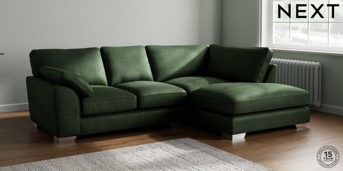 7.3.1 Buy Stamford Grand Relaxed Sit Medium Corner Chaise - Right Hand Luxe Chenille Dark Green Large Square Angle - Chrome Metal from the Next UK online shop Click here to use our accessible website