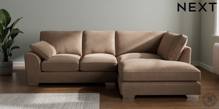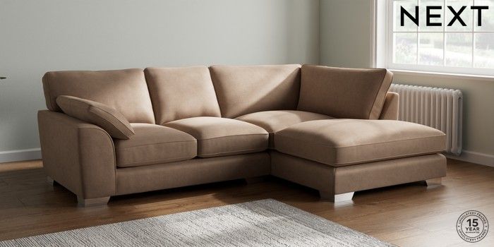 7.3.1 Buy Stamford Grand Relaxed Sit Medium Corner Chaise - Right Hand Luxe Chenille Mid Natural Large Square Angle - Chrome Metal from the Next UK online shop Click here to use our accessible website