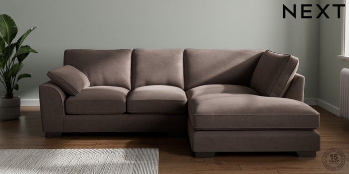 7.3.1 Buy Stamford Grand Relaxed Sit Medium Corner Chaise - Right Hand Luxe Chenille Mink Brown Large Square Angle - Gunmetal from the Next UK online shop Click here to use our accessible website