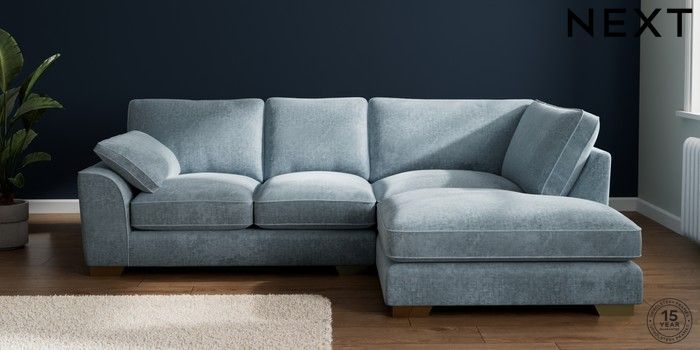 7.3.1 Buy Stamford Grand Relaxed Sit Medium Corner Chaise - Right Hand Plush Chenille Light Blue Large Square Angle - Brushed Brass from the Next UK online shop