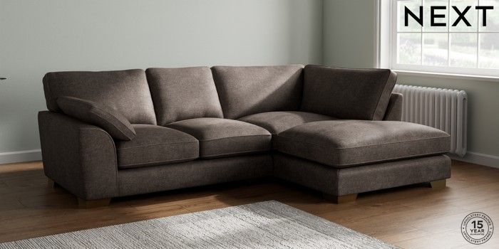 7.3.1 Buy Stamford Grand Relaxed Sit Medium Corner Chaise - Right Hand Plush Chenille Mink Brown Large Square Angle - Brushed Brass from the Next UK online shop Click here to use our accessible website