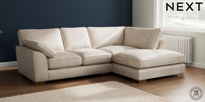 7.2.10 Buy Stamford Grand Relaxed Sit Medium Corner Chaise - Right Hand Plush Chenille Oyster Large Square Angle - Brushed Brass from the Next UK online shop Click here to use our accessible website