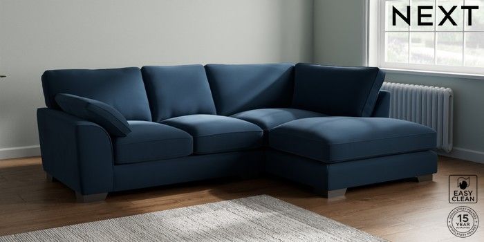 7.3.1 Buy Stamford Grand Relaxed Sit Medium Corner Chaise - Right Hand Plush Velvet Easy Clean Airforce Blue Large Square Angle - Gunmetal from the Next UK online shop Click here to use our accessible website