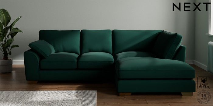 7.3.1 Buy Stamford Grand Relaxed Sit Medium Corner Chaise - Right Hand Plush Velvet Easy Clean Bottle Green Large Square Angle - Brushed Brass from the Next UK online shop Click here to use our accessible website