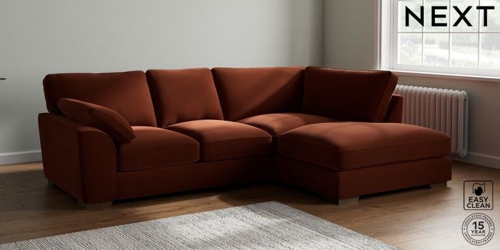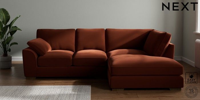 7.3.1 Buy Stamford Grand Relaxed Sit Medium Corner Chaise - Right Hand Plush Velvet Easy Clean Ginger Orange Large Square Angle - Mid from the Next UK online shop Click here to use our accessible website
