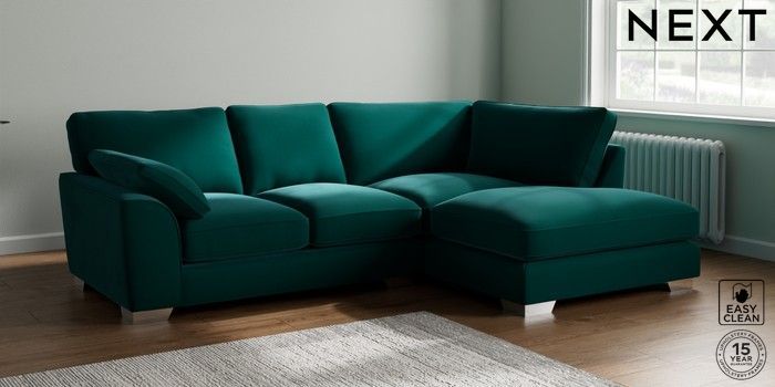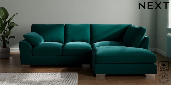 7.3.1 Buy Stamford Grand Relaxed Sit Medium Corner Chaise - Right Hand Plush Velvet Easy Clean Juniper Green Large Square Angle - Chrome Metal from the Next UK online shop Click here to use our accessible website