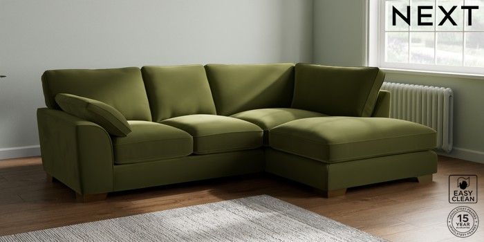 7.3.1 Buy Stamford Grand Relaxed Sit Medium Corner Chaise - Right Hand Plush Velvet Easy Clean Mid Olive Green Large Square Angle - Brushed Brass from the Next UK online shop Click here to use our accessible website
