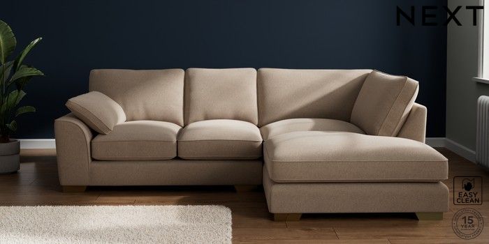 7.3.1 Buy Stamford Grand Relaxed Sit Medium Corner Chaise - Right Hand Tweedy Blend Easy Clean Light Dove Natural Large Square Angle - Brushed Brass from the Next UK online shop Click here to use our accessible website