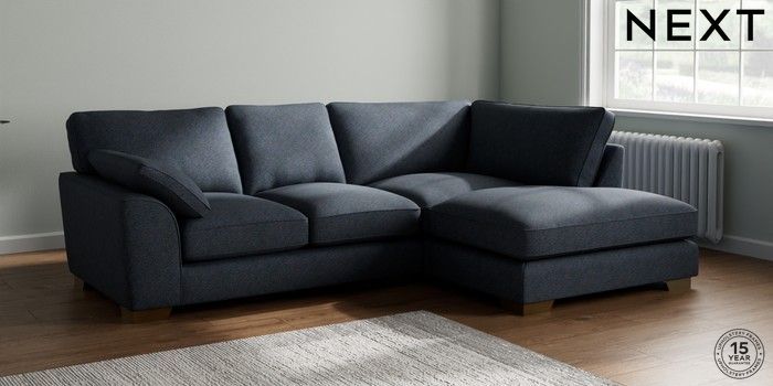 7.3.1 Buy Stamford Grand Relaxed Sit Medium Corner Chaise - Right Hand Tweedy Chenille Navy Blue Large Square Angle - Brushed Brass from the Next UK online shop Click here to use our accessible website