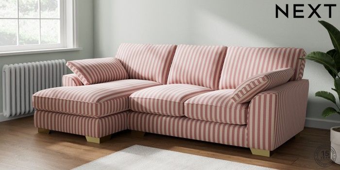 7.2.10 Buy Stamford Grand Relaxed Sit Medium Sofa Chaise - Left Hand Bold Chenille Stripe Dark Pink Large Square Angle - Brushed Brass from the Next UK online shop Click here to use our accessible website