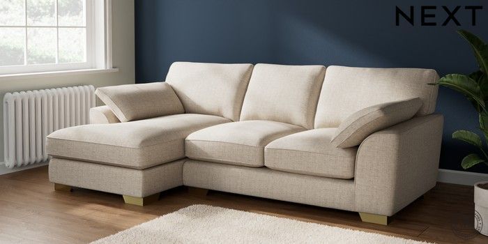 7.2.10 Buy Stamford Grand Relaxed Sit Medium Sofa Chaise - Left Hand Chunky Weave Mid Natural Large Square Angle - Brushed Brass from the Next UK online shop Click here to use our accessible website