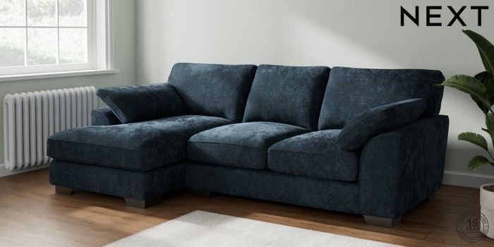 7.3.1 Buy Stamford Grand Relaxed Sit Medium Sofa Chaise - Left Hand Distressed Velour Midnight Blue Large Square Angle - Gunmetal from the Next UK online shop Click here to use our accessible website